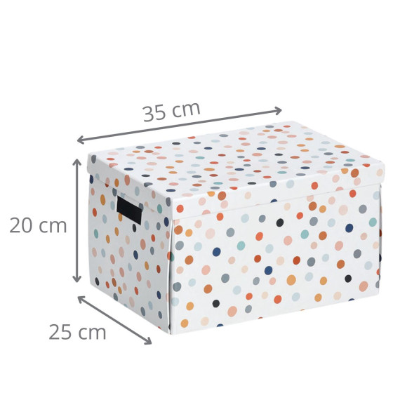 Son motif à pois est joli et original. Sa poignée permet de la manipuler facilement. Cette boîte en carton plaira aux enfants comme aux adultes. Elle donne envie de ranger.